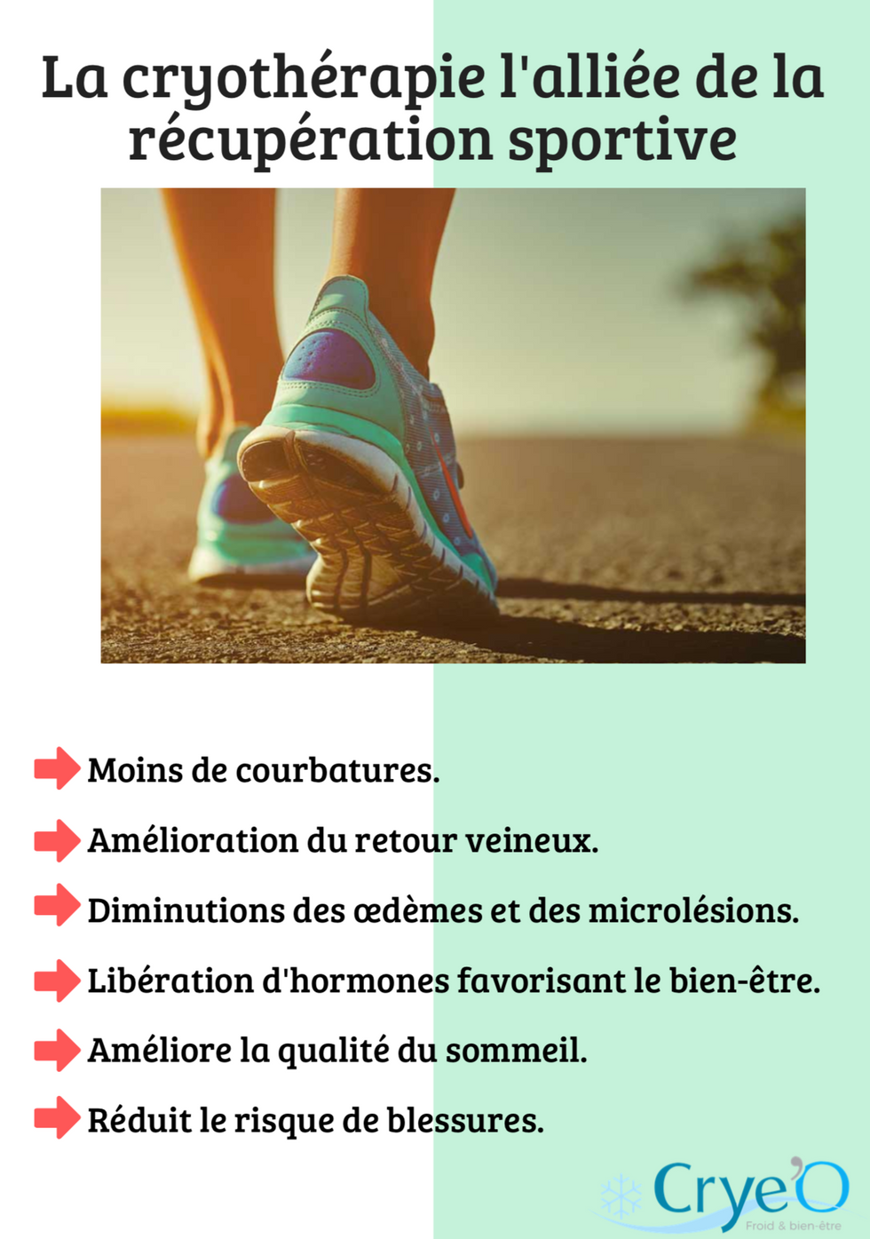 ➡️ Le froid. Le froid est un allié pour votre récupération. Lors d’une séance de Cryothérapie Corps Entier, l’exposition au froid intense va créer un choc thermique et permettre de mieux éliminer les toxines produites lors de l’effort, améliorer l’oxygénation des muscles et diminuer les inflammations causer par l’effort.